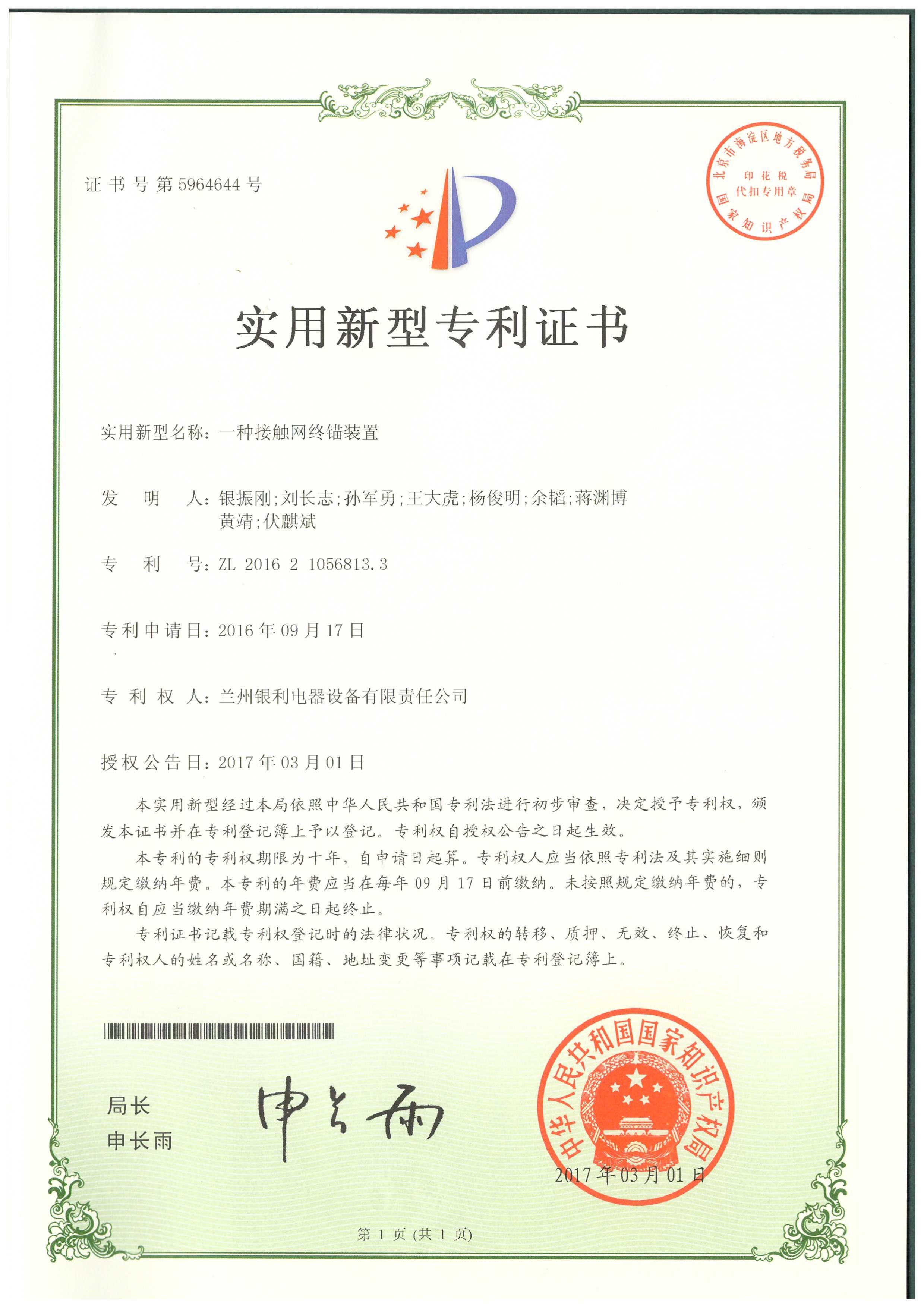 公司移動接觸網(wǎng)終錨裝置于2017年3月1日獲得實用新型專利授權(quán)。